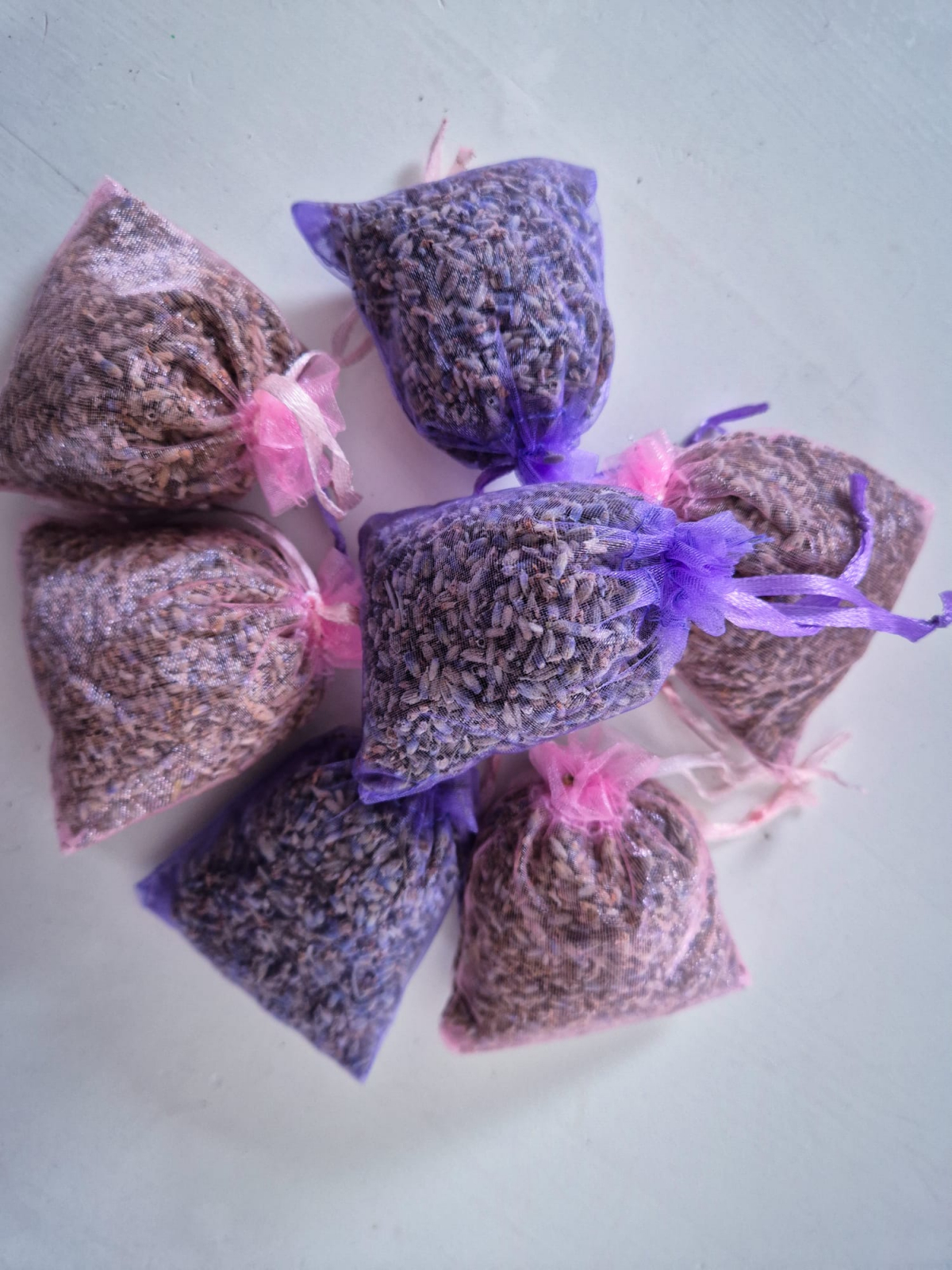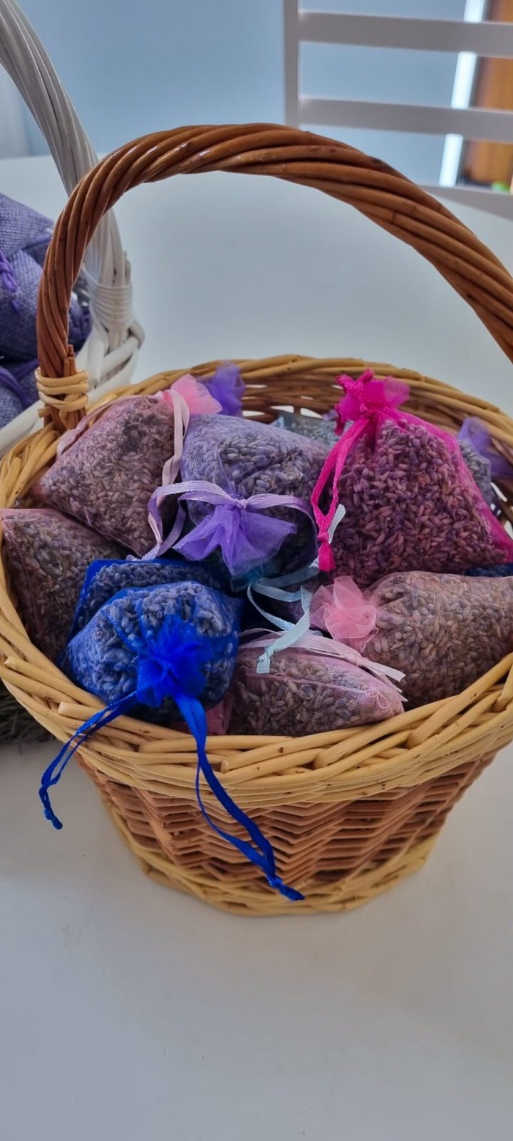 Umpluți cu flori uscate de lavandă, săculeții de diverse mărimi și culori împrospătează